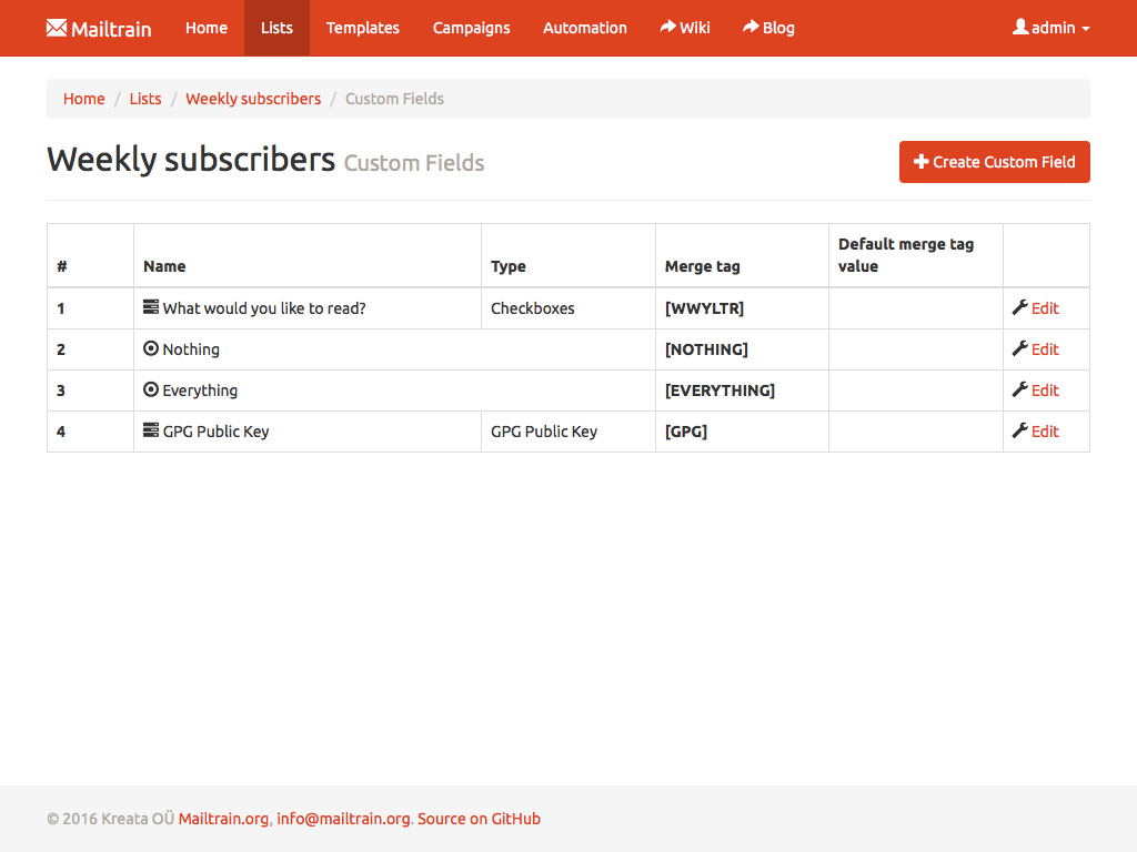 Text fields, numbers, drop downs or checkboxes, Mailtrain has them all. Every custom field can be included in the generated newsletters through merge tags. Mailtrain also supports custom forms.